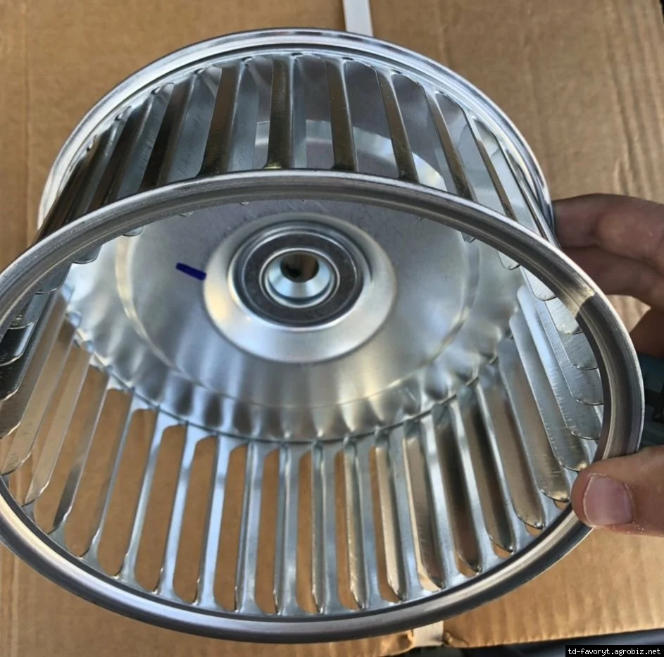 Крыльчатка имеет радиальный принцип работы который при перемещении воздуха изменяет его направление. Изготовлена крыльчатка из оцинкованной стали толщиной 0.6 миллиметра, и имеет лопасти загнуты вперед что делает ее более производительной.