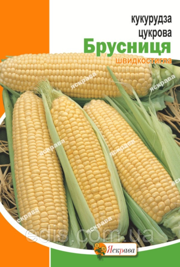 Кукурудза Брусниця 40 г Скоростиглий сорт. Вегетаційний період від сходів до технічної стиглості - 75-85 днів. Качани циліндричні, довжиною 16-20 см, діаметром 4-5 см, масою 140-170 р. Зерно жовтого кольору, соковита і солодка, відмінних смакових якостей. Його використовують для консервації, заморожування і споживання у вареному вигляді. Для продовження періоду збору свіжих качанів, кукурудзу висівають кілька разів, через 10-15 днів.