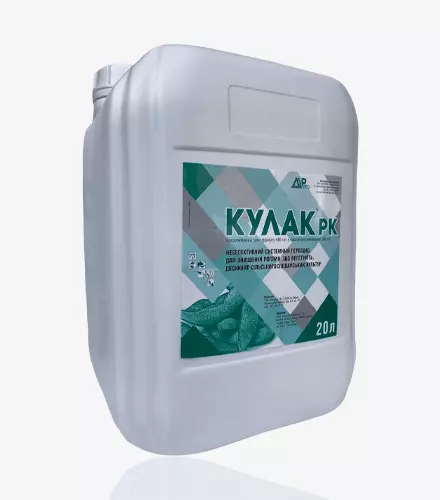 Назва товару: Кулак Короткий опис: Кулак — це системний гербіцид, призначений для боротьби з широким спектром однорічних та багаторічних бур’янів на сільськогосподарських угіддях та землях несільськогосподарського використання. Також використовується як десикант соняшнику та зернових культур. Механізм дії: Гліфосат, який є діючою речовиною препарату, ефективно поглинається надземною частиною рослин, розносячись по всіх органах і порушуючи фізіологічні процеси, що призводить до повної загибелі рослин, у тому числі і їх кореневої системи. Переваги: - Препарат містить сучасну поверхнево-активну речовину, яка забезпечує швидке й ефективне проникнення через листя та інші зелені частини рослини. - Повна загибель бур’янів настає через 10 - 20 днів після застосування. Особливості застосування: - Обприскування рекомендується проводити зранку до 10:00 чи ввечері з 18:00 до 22:00. - Температура повітря не повинна перевищувати +22°C. - При авіаційно-хімічних роботах необхідно дотримуватися особливих заходів безпеки, зокрема, виконувати обробку на висоті до 3 метрів над об'єктом обробки, а сигнальники повинні використовувати засоби індивідуального захисту.