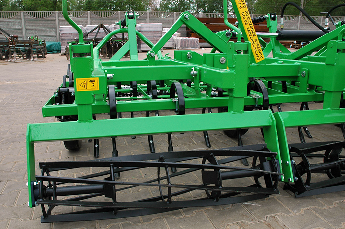 Почвообрабатывающий агрегат это соединение двух почвообрабатывающих орудий – культиватора и заднего одинарного или двойного катка. Зубья культиватора креплятса в 4 рядах на расстоянии 100 мм и окончены легко заменяемыми рыхлительными долотами. Имеется возможность установки в задней части агрегата одинарного или двойного зубчатого струнного катка диаметром φ 295 мм монтирующего на втулках или подшипниках.