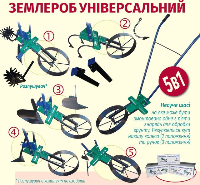 Універсальний землероб — це незамінний помічник для Вашого городу, дачі або садової ділянки. Простий в експлуатації й обслуговуванні, він уже давно став добрим другом селян і дачників.Агрегат виник унаслідок еволюції всім відомого підгортувача для картоплі. Він дає змогу виконувати не тільки підгортання, а практично будь-які операції з оброблення ґрунту на Вашій ділянці.