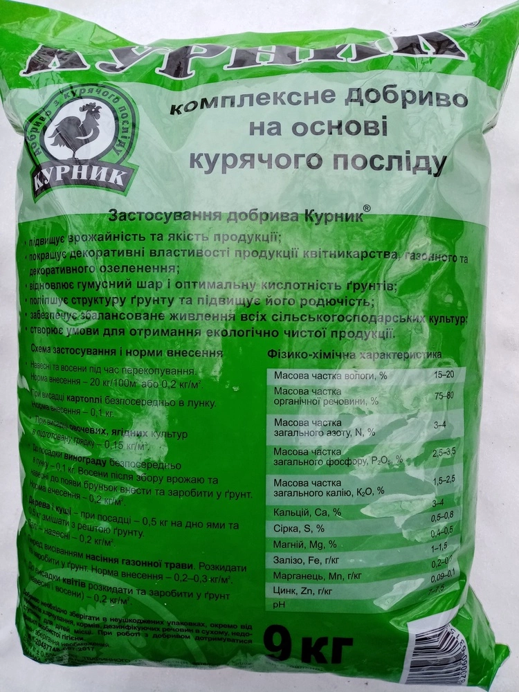 Основным преимуществом удобрения "Курнык " является его экологичность , высокотемпературная обработка надежно дезинфицирует и обезвреживает куриный помет от возбудителей инфекционных и инвазионных заболеваний .