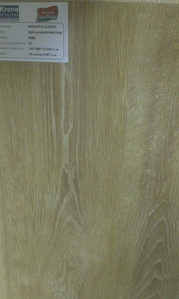 Артикул 8484 (Дуб Каліфорнійській). Клас 31 (AC3) - для домашнього використання і громадських приміщень з низьким навантаженням. У житлових приміщеннях середній термін експлуатації такого ламінату 12-13 лет.Насищенние кольору, природна структура поверхні, особливого блиску і відчуття, як від дотику до дерева - це основні характеристиками ламінату Кроноспан.