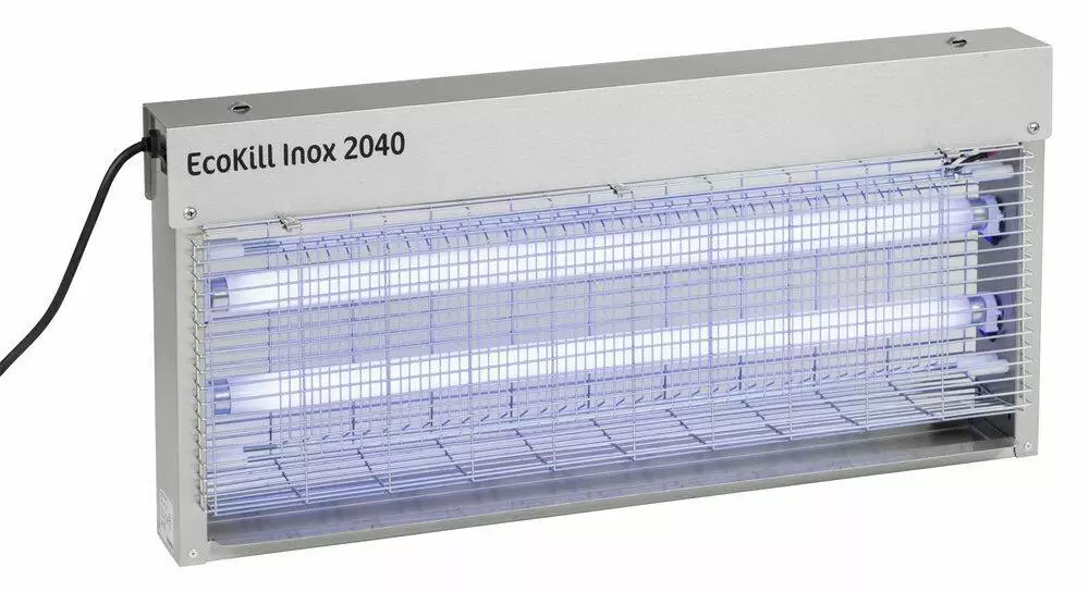Електричний знищувач мух EcoKill Inox з корпусом з високоякісної сталі оснащений спеціальними ультрафіолетовими лампами, які характеризуються своєю довговічністю. Корпус пристрою оброблений матовим покриттям, відмінно чиститься і зберігає презентабельний вигляд протягом тривалого часу. Конструкція з виступаючою граткою обумовлює оптимальні властивості уловлювання.