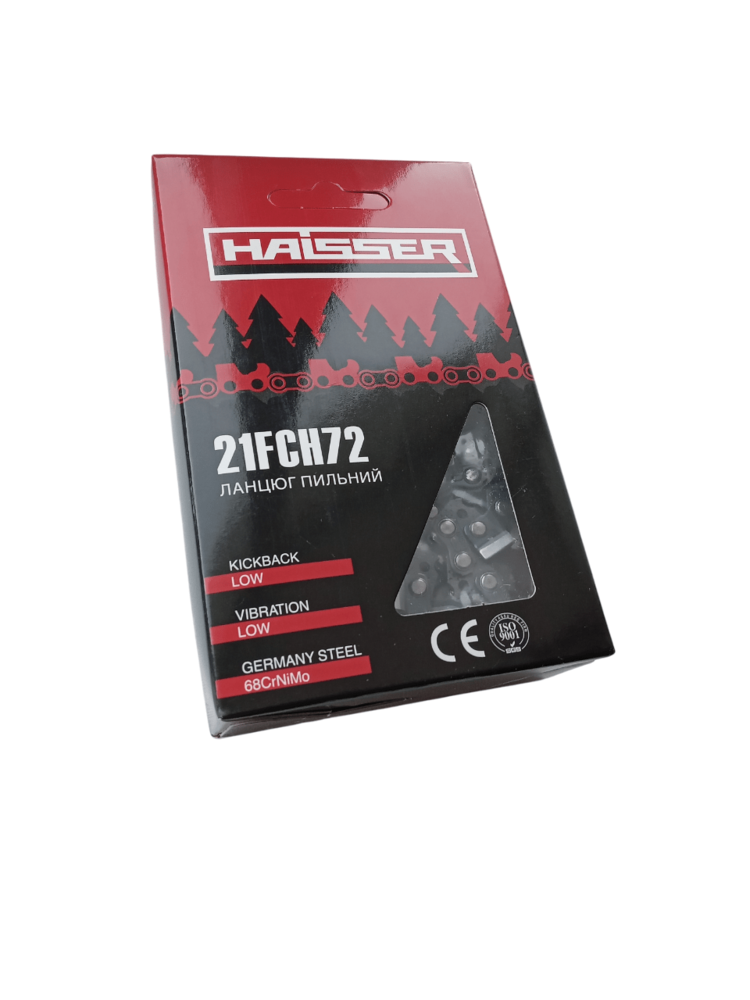 Ланцюг HAISSER 21FCH72 - 72 ланки, паз 1,5мм 0,58'', крок 0,325'' - це високоякісний ріжучий ланцюг для бензопил, розроблений для ефективного та чистого розпилювання деревини.