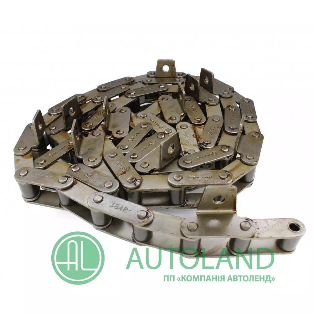 п»їЛанцюг транспортера похилої камери зернозбиральних комбайнів Claas. Крок ланцюга - 38.4 мм. Каталожні номера: 771106, 771106.0, 0007711060, 771106.41Використання:Запчастина вузла похилої камери зернобирального комбайна Claas.Призначення:Формування втягуючого транспортера похилої камери який забезпечує просування зрізаної жаткою зернової маси в напрямку молотильного барабана комбайна.Використовується для заміни зношених або пошкоджених деталей в ході ремонтно-відновлювальних робіт.Властивості:Транспортерний роликовий довголанковий ланцюг у якості зовнішніх ланок якого у заданій послідовності використовуються спеціальні ланки з лапками та отворами для кріплення планок транспортера похилої камери комбайна.