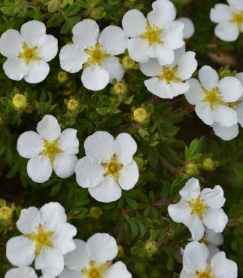 Сорт з щільною, широкою, подушковидною кроною. Пагони розташовані вертикально, нижні звисаючи, утворюють шлейф. Листя світло-зелені. Квіти білі, розкриваються в червні і зберігаються на кущах до кінця вересня. Помірно вимогливий до води і родючості грунту, але краще розвивається на родючому. Ідеальний в одиночних і групових посадок на газоні. Добре переносить стрижку і довго зберігає декоративний компактний вид.