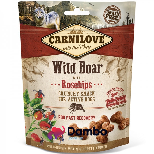 Crunchy Wild Boar with Rosehips - вишукані ласощі для всіх собак з диким кабаном та шипшиною. Беззернова формула ласощі ідеально підійде для собак, які страждають на алергію або харчову непереносимість.