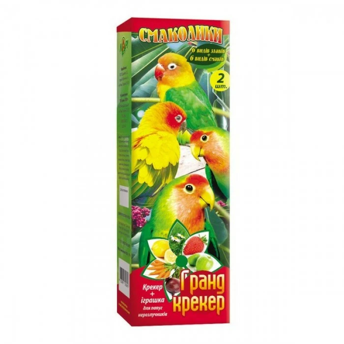 ГРАНД КРЕКЕР Є одночасно смачною, поживною їжею та іграшкою для птахів. В одній упаковці міститься 6 міні-крекерів, кожен з яких має свій неповторний смак. При виготовленні крекерів використовуються 6 видів злаків: пшениця, овес, гречана крупа, ячмінь, рис, просо; 6 видів смаків: буряк, полуниця, лимон, морква, яблуко, лугові трави. У складі смачних крекерів ягоди, овочі, фрукти у вигляді сублімованих шматочків. Також для ігри та забави Ваших домашніх улюбленців додаються шматочки дерева і шкіри. В одній коробці 2 шт.