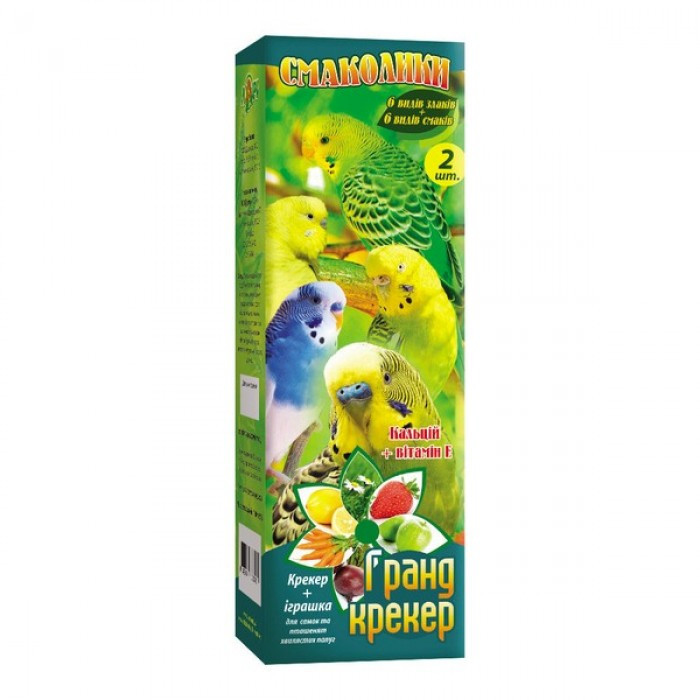 ГРАНД КРЕКЕР Є одночасно смачною, поживною їжею та іграшкою для птахів. В одній упаковці міститься 6 міні-крекерів, кожен з яких має свій неповторний смак. При виготовленні крекерів використовуються 6 видів злаків: пшениця, овес, гречана крупа, ячмінь, рис, просо; 6 видів смаків: буряк, полуниця, лимон, морква, яблуко, лугові трави. У складі смачних крекерів ягоди, овочі, фрукти у вигляді сублімованих шматочків. Також для ігри та забави Ваших домашніх улюбленців додаються шматочки дерева і шкіри. В одній коробці 2 шт.