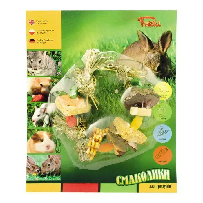 СМАКОЛИК ДЛЯ ГРИЗУНІВ №2 Яскраві, сучасні, зручні, якісні ласощі для гризунів в герметичній упаковці. Смаколики - це поєднання приємного смаку, сучасних технологій і теплоти людських рук. Ви зможете використовувати іграшку для гризуна як до поїдання делікатесів, так і після. Містить зернові крекери різних смаків, сублімовані овочі і фрукти, шматочки шкіри і дерева.