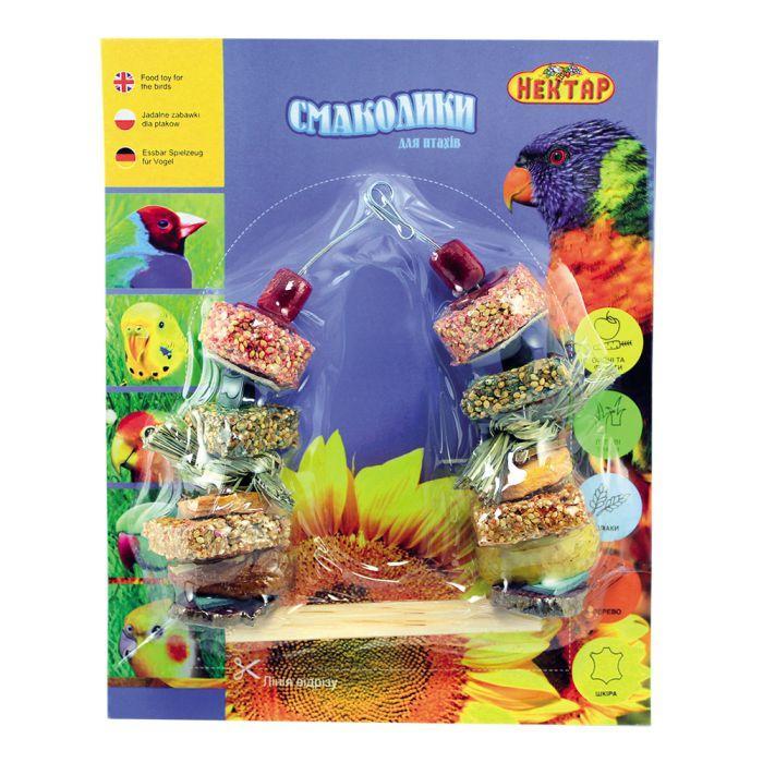 Великі смаколики для птахів №1 - це ласощі + іграшка, чудове поєднання гарного смаку, сучасних технологій та тепла людських рук. Пташки гратимуться як до поїдання смачних делікатесів так і після. Виріб містить зернові крекери різних смаків, сублімовані овочі та фрукти, шматочки шкіри та дерева.