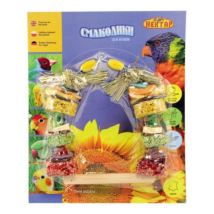 Великі смаколики для птахів №2 - це ласощі + іграшка, чудове поєднання гарного смаку, сучасних технологій та тепла людських рук. Пташки гратимуться як до поїдання смачних делікатесів так і після. Виріб містить зернові крекери різних смаків, сублімовані овочі та фрукти, шматочки шкіри та дерева. Вузлики сушених лугових трав будуть джерелом клітковини для підтримання нормального перебігу обмінних процесів в організмі.
