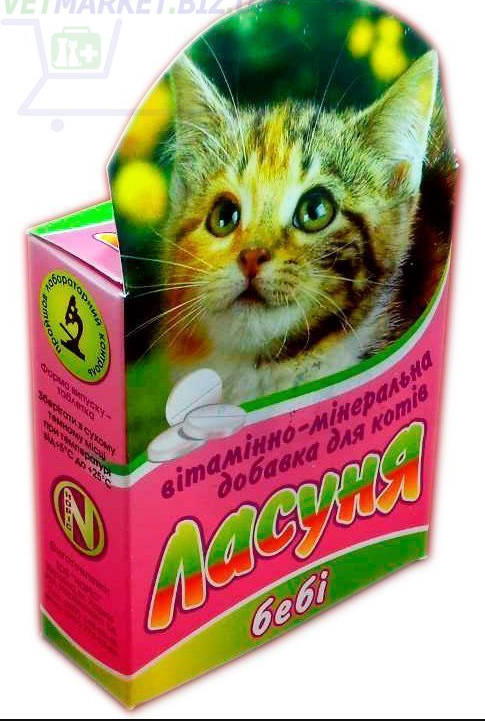 Ласуня Бебі вітамінно-мінеральна добавка для кошенят - профілактична, лікувальна добавка з вмістом вітамінів, мікро- та макроелементів, які мають велику місткість білків та жирів для кошенят.