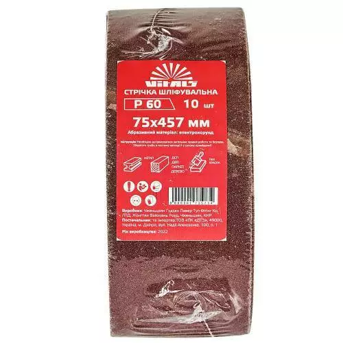 Стрічка шліфувальна Vitals 75х457 мм з зернистістю Р60 призначена для шліфування різноманітних матеріалів, включаючи ДВП, ДСП, тверду деревину, паркет, лакофарбові покриття та метал.