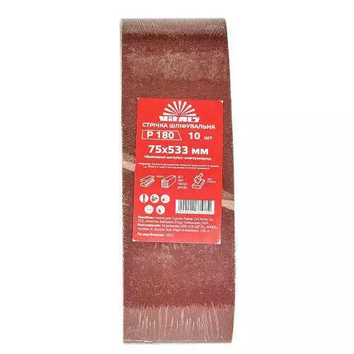 Зернистість Р180 дозволяє виконувати фінальне шліфування з видаленням дрібних подряпин та створенням гладкої поверхні. Ширина стрічки становить 75 мм, а довжина - 533 мм, що забезпечує покриття широкої площі та ефективність роботи.