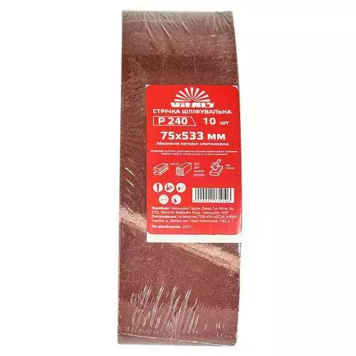 Стрічка шліфувальна Vitals розміром 75х533 мм з зернистістю Р240 призначена для шліфування різних матеріалів, таких як ДВП, ДСП, тверда деревина, паркет, лакофарбові покриття та метал.