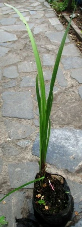 Листя вузьколінійне, яскраво-зелене, м'ясисте, мечеподібне, чарівне, завширшки 2-5 і завдовжки 60-120 см, з одного боку жолобчасте, з іншого — з гострим ребром, розташовані на верхівках і бічних відгаліях кореневищ. Листя зростає один з одним, оточуючи головний виріб, тож суцвіття ніби виходить із середини аркуша.