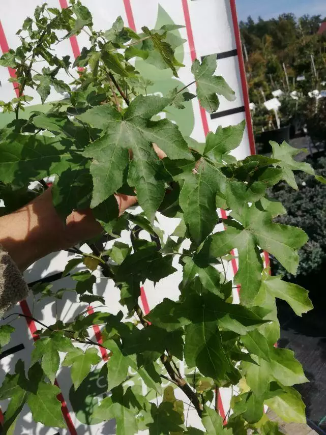 Листя: схожі на листя клена, 3-5 лопатеві, шириною 10 - 18см, зубчасті по краю, з приємним ароматом. Верхня сторона темно-зелена, злегка блискуча, нижня - зелено-матова. Восени набирають темно-пурпурове, багряно-червоне забарвлення листя.