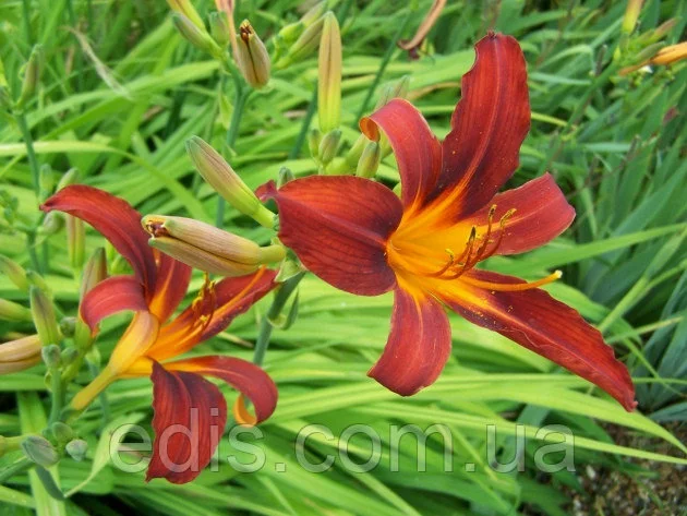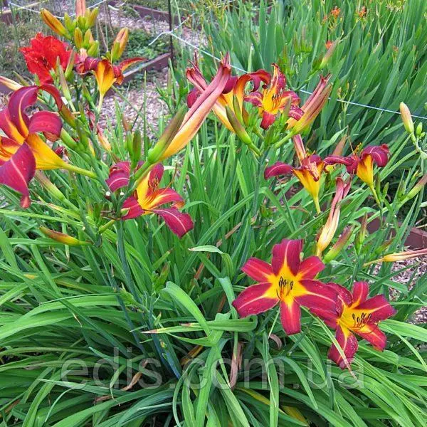 Пелюстки вузькі, внутрішні – більш широкі. Основний колір – червоно-коричневий. По центру пелюсток по всій довжині проходить світлий промінь. Горло оранжево-жовте.