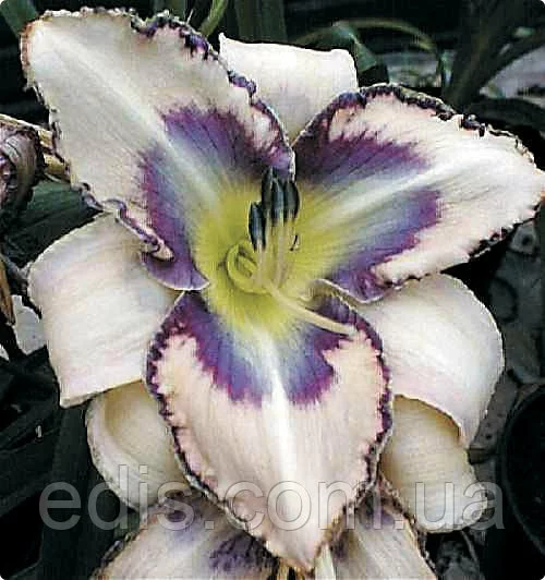 Великі ароматні квітки кремового кольору з широким лавандовим вічком і окантовкою, горло жовто-зелене.