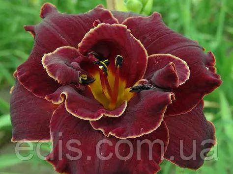 форма - махрова, колір бордовий з жовтою облямівкою і горловиною;