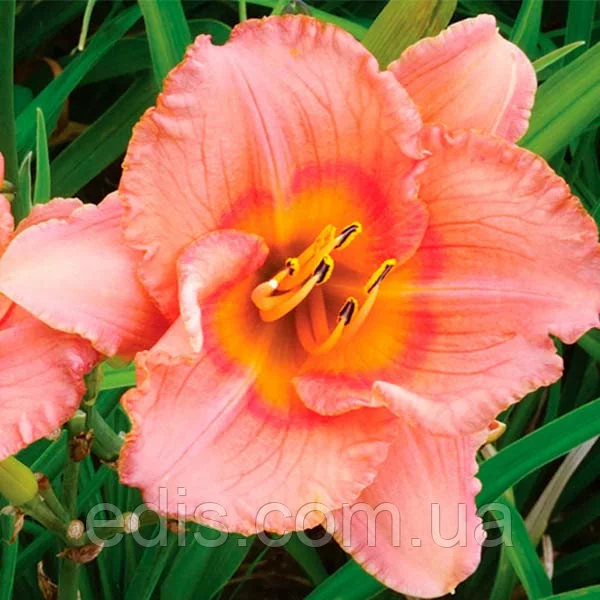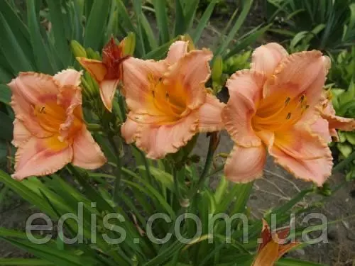 Класичний сорт лілійнику з яскравими квітками. Основне забарвлення квітки креветочно-рожевий, вічко коралово-червоний, горло золотисто-жовте або салатово-жовте. Квітка округлий, 9-10 см в діаметрі, з гофрованого одноколірної окантовкою.