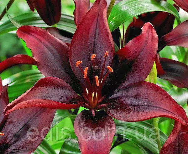 Чудовий сорт з великими, ОТкритими, шовковистим квітками магічного забарвлення. Яскраві оранжево-руді тичинки контрастно підкреслені на тлі темно-вишневих пелюсток.