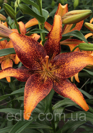 Лілія азіатська Tango Kentucky Ще одна веснянкувата красуня зі знаменитої серії Танго – Кентуккі. Основний колір – помаранчевий, крап і пильовики – темно-пурпурові. Висота квітконосу: 90-100 див Діаметр квітки – до 16 див. На одному стеблі формується ОТ 2 до 12 бутонів. Термін цвітіння: кінець червня - початок липня. В нашем интернет-магазине можно купить луковицы лилии Кентукки в розницу по 1 шт., мелким оптом со скидкой - от 3 шт., оптом (мин. сумма заказа 2000 грн.) - в разделе Опт Сажать лилии можно и весной, и осенью. Осенью – через 30-40 дней после цветения, когда стебель начинает усыхать и аж до первых морозов. Весной лучше начинать посадку во второй половине апреля, потому что молодые ростки лилий могут повреждаться морозами. При подготовке участка под лилии, помните, что лилии, как и все луковичные растения, не переносят внесения свежей органики и изобилия азотных удобрений. Як і всі азіатки, лілії серії Танго воліють сонячне місце, нейтральні або слабокислі, помірно вологі, поживні грунту. Азіатські гібриди можна вирощувати на одному місці без пересадки протягом 3-4 років. На 4-5 рік навколо материнської цибулини проростає безліч дочірніх цибулин, помітно знижується висота квітконоса, кількість бутонів. Це означає, що гніздо цибулин пора розділити. А на цьому місці не варто вирощувати цибулинні рослини протягом двох років.