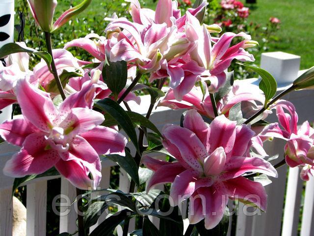Благородна красуня лілія Sweet Rosy Світ Розі - один із найефектніших східних гібридів з пишними, яскравими, ароматними махровими квітками. Ця лілія не загубиться в саду, вона стане вишуканою прикрасою найурочистіших подій, прекрасним подарунком. Ця лілія не просто дивно довго і ефектно цвіте, вона так само довго зберігає свіжість у вазі, ОТкриваючись до останнього квітки. Квіти малиново-рожеві з більш темною полосою по центральній лінії пелюсток і тонкою білою облямівкою, мають добре виражену махрова в 3-4 ряди пелюсток. Тичинки ОТсутні. Квітки дуже великі - до 25 см, на довгих черешках, направлені в сторони. Стебло 80-110 див. у висоту. На стеблі зазвичай 6-8 квіток. Цвітуть махрові східні лілії зазвичай пізніше інших лілій - в кінці липня-серпні. Аромат східних гібридів досить сильний, але більш приємних і благородний, ніж у трубчастих. Східні гібриди ОТдають перевагу сонячним або напівтінистим ділянки з легким, водопроникним грунтом слабокислою або нейтральною реакцією. Не можна східні гібриди садити в місцях, де накопичується дощова або зовнішня вода. При сприятливих умовах (суха осінь, сніжна зима) східні гібриди чудово зимують без всякого укриття. Небезпека представляє перезволожений осінніми затяжними дощами грунт і безсніжна зима. Для кращої зимівлі можна восени, в період затяжних дощів, посадки лілій накрити поліетиленом, захистивши таким чином грунт ОТ зайвої вологи. Якщо це не було зроблено, краще вкрити посадки на зиму сухим, пухким укриттям (листя, тирса і т. д.)