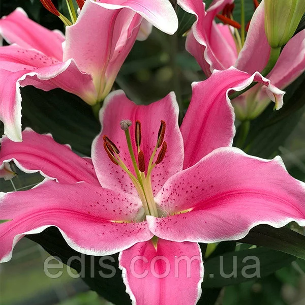 Бутони благородного рожевого кольору. Пелюстки з темно-пурпуровими штрихами і цяточками, і білосніжним облямівкою по краю. Тичинки — жовто-зеленого ОТтінку. На кожному квітконосі 3-4 бутона. Підходить для зрізання на букети.