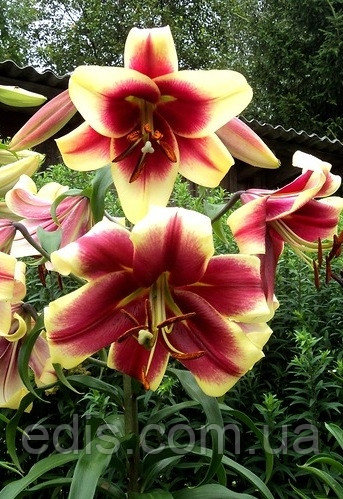 Дуже яскрава, помітна лілія. Квітки великі, широко ОТкриті, дивляться в сторони. Забарвлення винно-бордовий з вершково-жовтими кінчиками, в горлі зелена зірка.