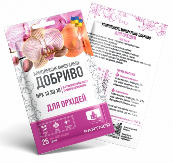 Для орхідей – комплексне добриво для всіх видів орхідей, призначене для кореневих та листових обробок під час росту та формування бутонів.