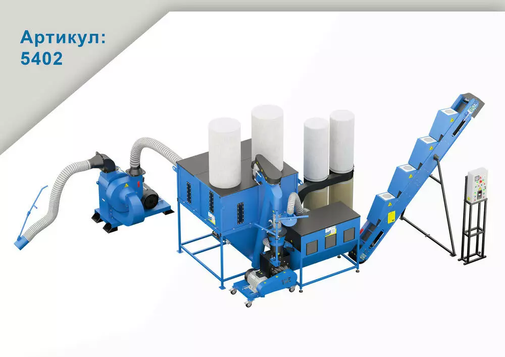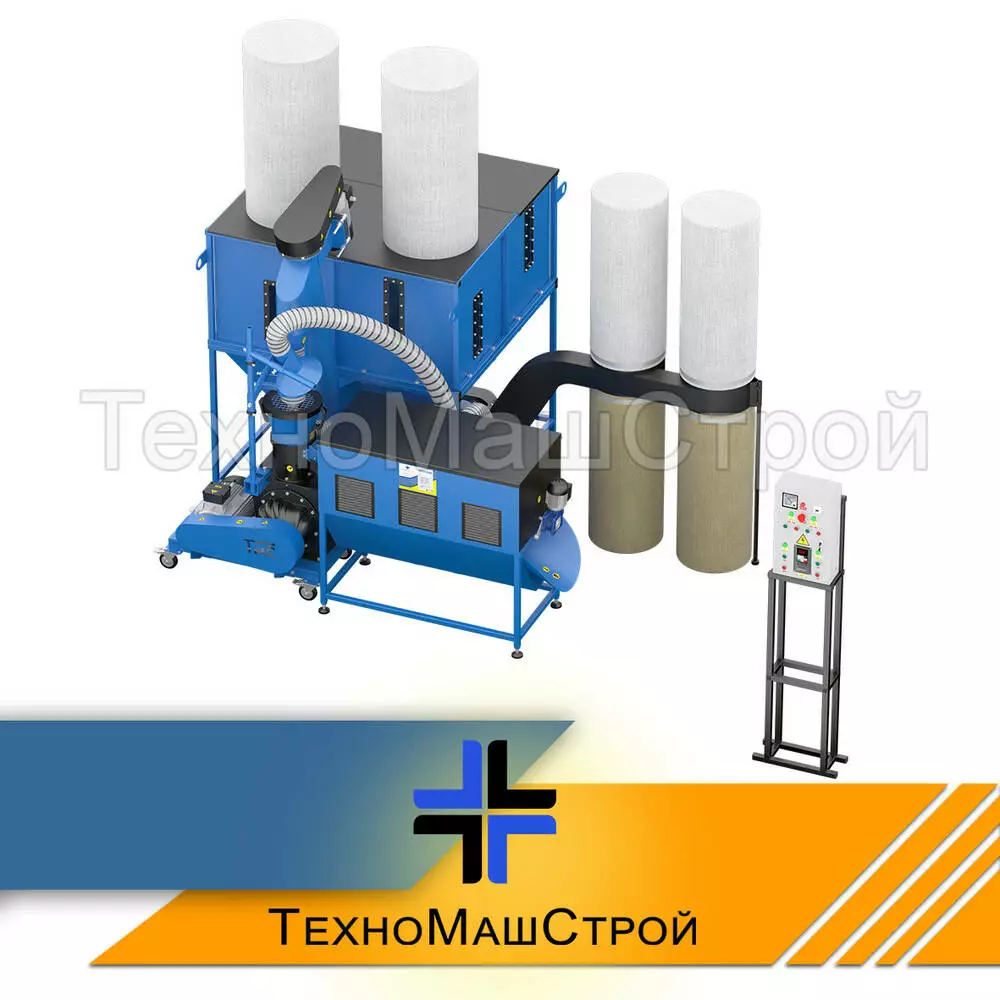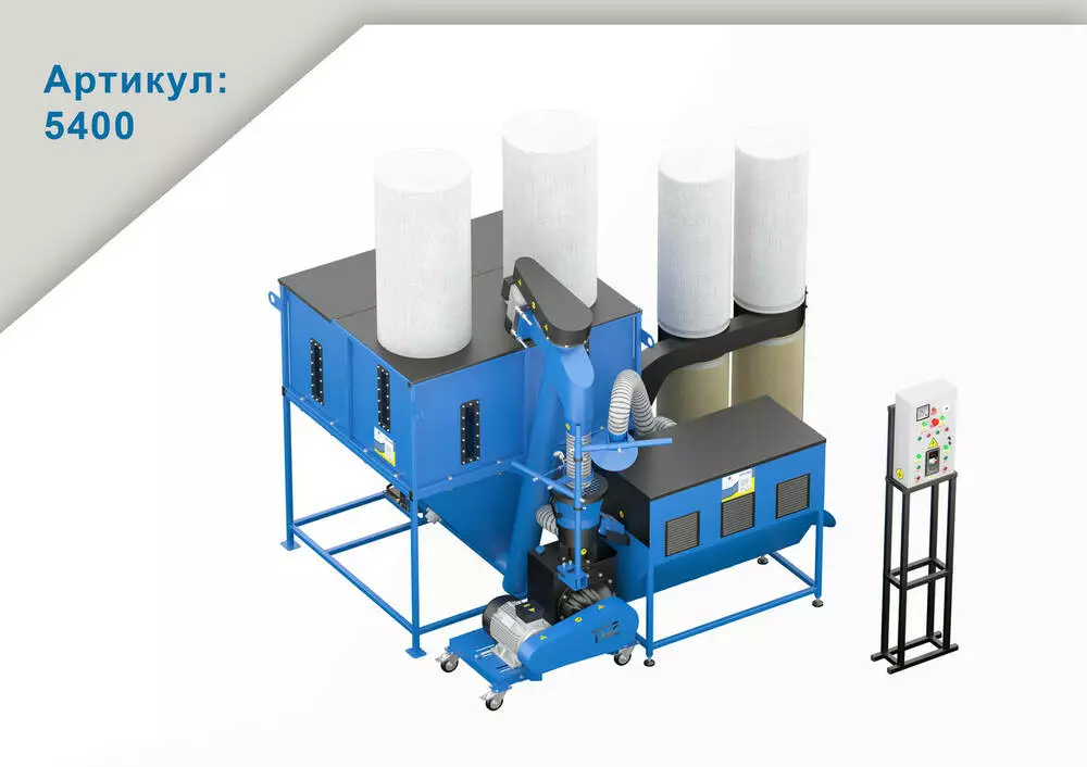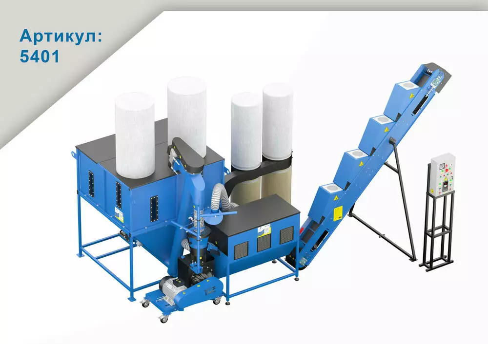 Цей апарат за допомогою свого вентилятора забезпечує циркуляцію повітря необхідного для охолодження гранул і збору відкаліброваних залишків сировини та пилу в ємності як мішків, які встановлені на ньому. Потужність 1,5 кВт.
