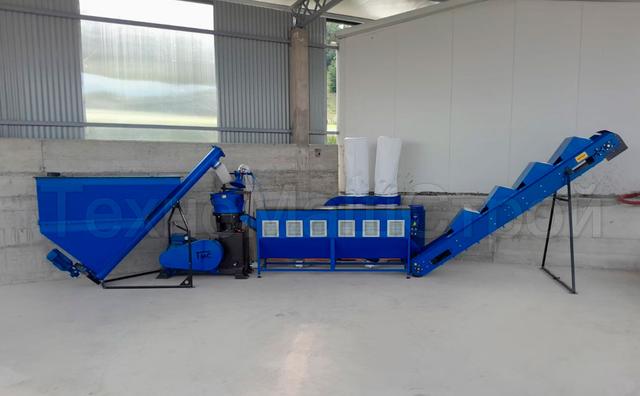 Обладнання для виробництва пелет та комбікормів від компанії ТехноМашСтрой, на базі гранулятора GRAND-400 PRO, призначене для виготовлення гранул від 6 мм до 8 мм на тирсі. Продуктивність на цій лінії дорівнює 750 кг/год ( в середньому за зміну)