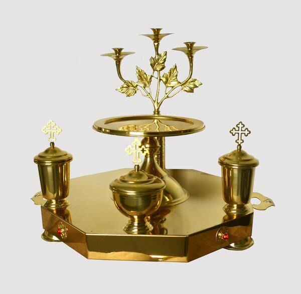 Пропонуємо всенічні блюда, які стануть справжньою окрасою урочистого Богослужіння. Набір складається з підноса з трьома ємностями з кришками, підставки та свічника на три свічки.