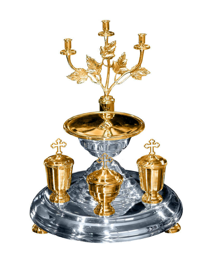 Пропонуємо всенічні блюда, які стануть справжньою окрасою урочистого Богослужіння. Набір складається з підноса з трьома ємностями з кришками, підставки та свічника на три свічки.