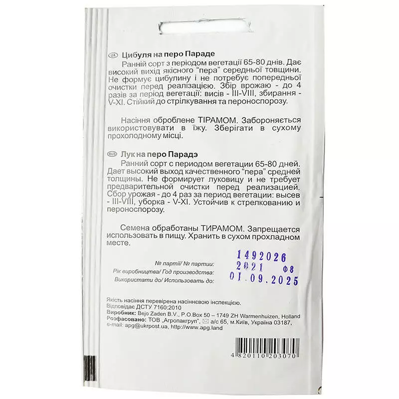 Цибуля-батун Параде - це унікальний сорт цибулі, цінною властивістю якого є здатність давати зелене перо рано навесні. Підходить для вирощування в ранньовесняний та осінньо-зимовий періоди. Дозволяє збирати врожай кілька разів на сезон. Вегетаційний період становить 40-42 дні. Формує гарне, тонке, м'ясисте темно-зелене перо середньої довжини. Листя потужне. Цибулина не утворюється.