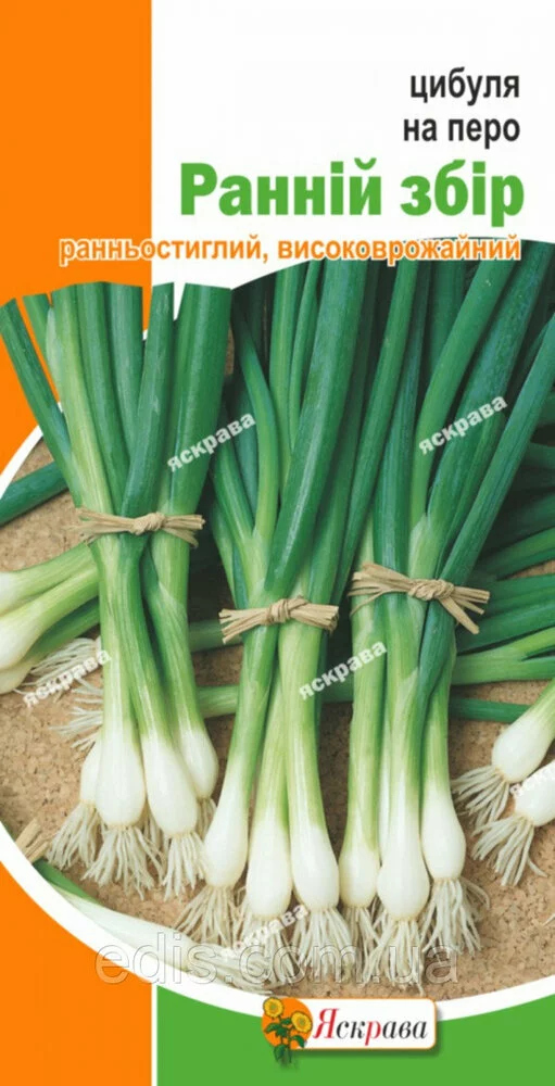 Цибуля на перо Ранній збір 8 гРанньостиглий урожайний сорт придатний для отримання ранньої зелені. Рекомендується для вирощування на садово-городніх ділянках, присадибних і фермерських господарствах. Формує велику цибулину і компактну зелену розетку листя. Листя середнього розміру, соковите, ніжне. Сорт відрізняється високою продуктивністю. Смак напівгострий. Рекомендується для використання у свіжому вигляді в салатах і вінегретах, супах, для прикраси закусок. Додають в овочеві, м'ясні та рибні страви, а також до м'ясного фаршу, в начинку пирогів, різні соуси, маринади, заливки. Можна заморожувати і використовувати в зимовий період як поливитаминную зелень. Посів насіння безпосередньо у відкритий гунт проводять в кінці квітня - початку травня, на глибину 1,0-1,5 см за схемою 4-5 х 10-15 див. Збір урожаю починають в кінці червня - початку липня, коли листя досягне висоти 20-30 см