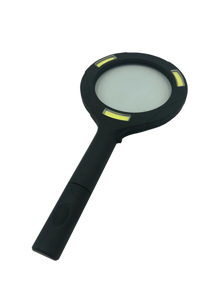 Лупа ручна кругла 3-кратне збільшення, діаметр лінзи 80 мм, зі світлодіодною підсвіткою — 3W COB LED супер'яскраві світлодіоди, розташовані біля лінзи, за потреби освітлюють будь-які об'єкти.