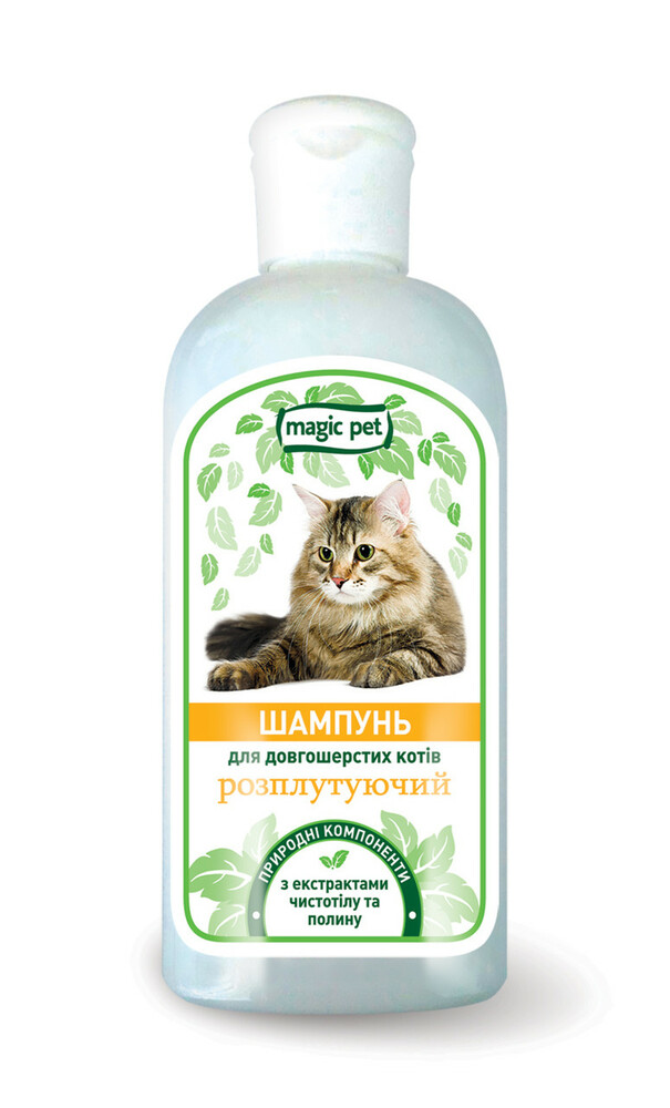 Magic Pet Розплутуючий - гігієнічний шампунь для котів спеціально розроблені для ефективного розплутування вовни довгошерстих котів.Допоміжні компоненти: екстракти лікарських трав (полину, пижма, чистотілу). Входить до складу паста хвойно-хлорофило-каротиновая сприяє загоєнню расчесов, викликаних ектопаразитами, надає шерсті тварини шовковистість і здоровий блиск.