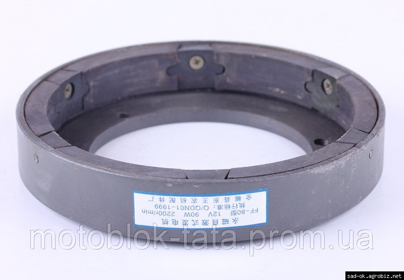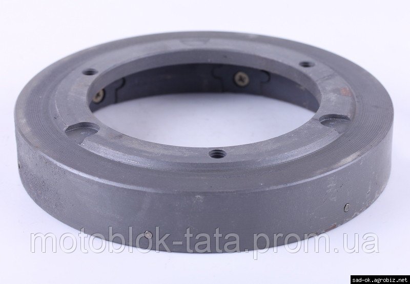 Магнит генератора (ротор) - 180N подходит на дизельные двигатели мотоблоков и мототракторов мощностью 7/8 л.с. с водяным охлаждением. Параметры: 12V 90W 2200r/min. Размер: наружный ?163mm, ?100mm, внутренний по магнитам ?136mm, H-30mm. Межболтовое расстояние: L-97mm. Вес: 1150 гр.