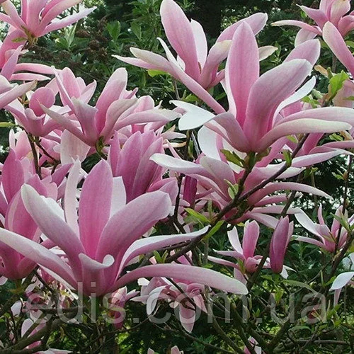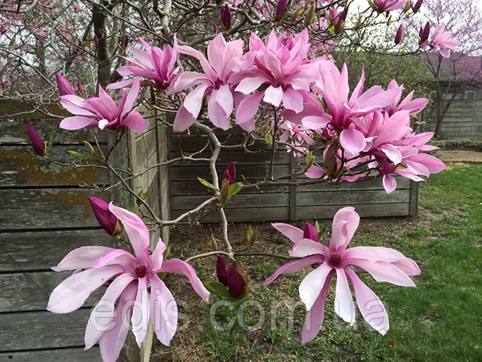 Квітки великі, видовжені, бутони червоно-пурпурні, всередині пелюстки яскраво-рожеві, майже білі, загальне враження при цвітінні – квітки рожеві. Цвіте у квітні-травні. Рясне цвітіння триває до появи листя.