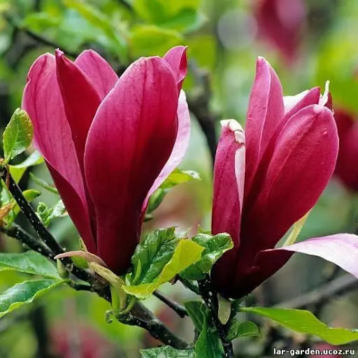 Весьма обильно и эффектно цветущая, пользующаяся большой популярностью в садово-парковом строительстве юга России. В отличие от рассмотренных видов растет в виде кустарника или низкоштамбового дерева, до 4 м высотой, с сильно ветвистой кроной и опадающей на зиму крупной, темно-зеленой листвой (20 х 10 см). Примечательны ее лилиеобразные цветки, до 11 см в диаметре, снаружи пурпуровые, внутри — белые, со слабым ароматом. Плоды винно-красного цвета, до 9 см, созревают в ноябре.