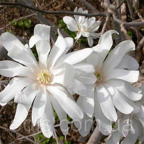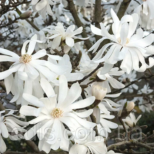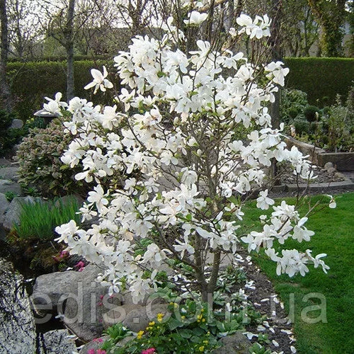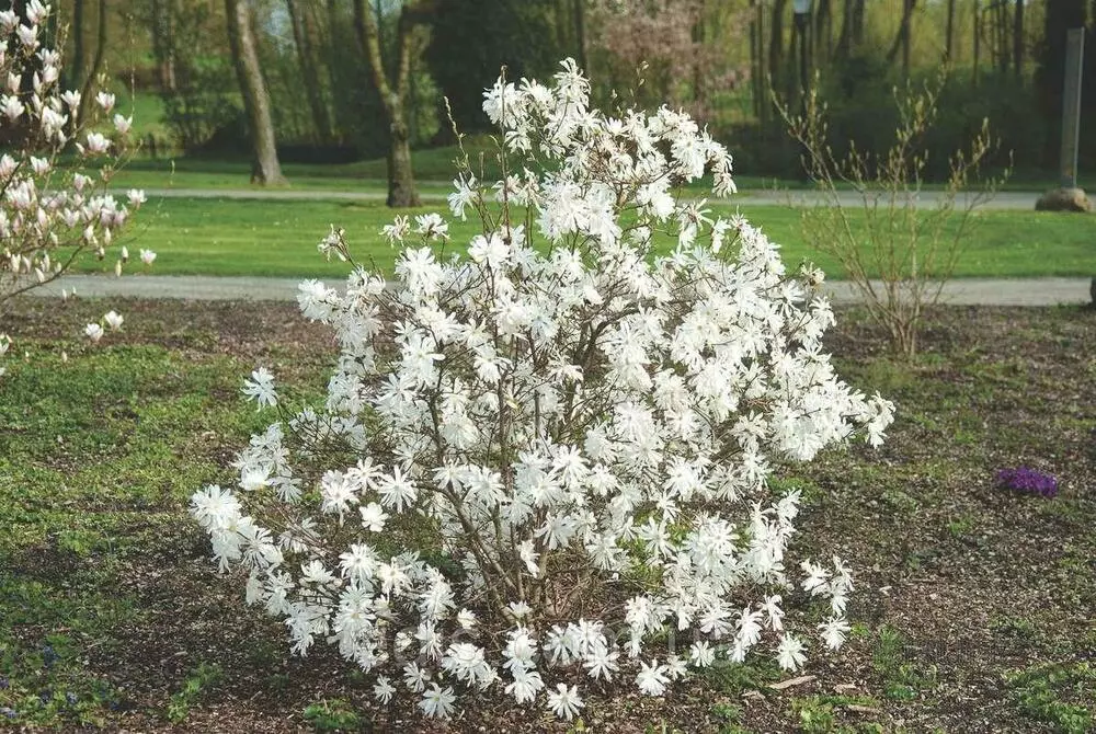 квіти магнолії Роял Стар: білосніжні, а до розкриття бутони мають рожевий відтінок;
