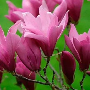 Магнолія 'Galaxy' - унікальний гібрид M. Lilliflora 'Nigra' та M. sprengeri 'Diva', що відрізняється як приємним солодким запахом квітів, так і, на відміну від інших сортів магнолій, своєю вузькою, пірамідальною формою. Вона має центральний стовбур і висхідні бічні пагони, що робить її ідеальною для посадки у невеликих садах. Темно-червоні та фіолетові квіти з'являються наприкінці весни, тому рослина уникає ризику постраждати від весняних заморозків. Цвіте довго, забезпечуючи приємний вигляд та чудовий солодкий аромат у саду. Листопадним магноліям потрібен вологий, помірно кислий або нейтральний ґрунт і висаджування на сонці або півтіні. У них дрібне коріння, яке збирає поживні речовини головним чином з верхнього шару ґрунту, тому потрібно звернути увагу при висадці на присипку над корінням магнолії якісного торфу, можливо з додаванням розчинних добрив тривалої дії. Не слід висаджувати магнолію надто глибоко – так можна вбити рослину. Для висадки виберіть місце, де в радіусі 2х метрів від магнолії ви не будете нічого копати або перекопувати - ця красуня досить егоїстична і не любить коли турбують її коріння, які вона розпускає широко довкола себе. Рослина повністю морозостійка. Через великі квітки і листя радимо висаджувати її в захищене від вітру місце і замульчувати коріння, щоб вона не втрачала вологу будь-якої пори року. Морозостійка від -27 до -29°C.