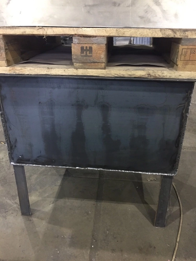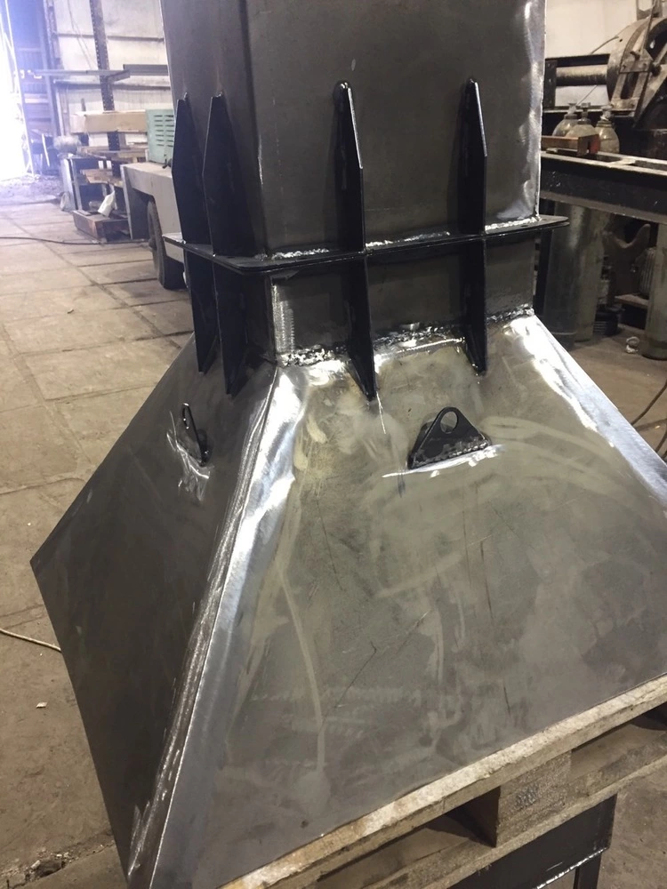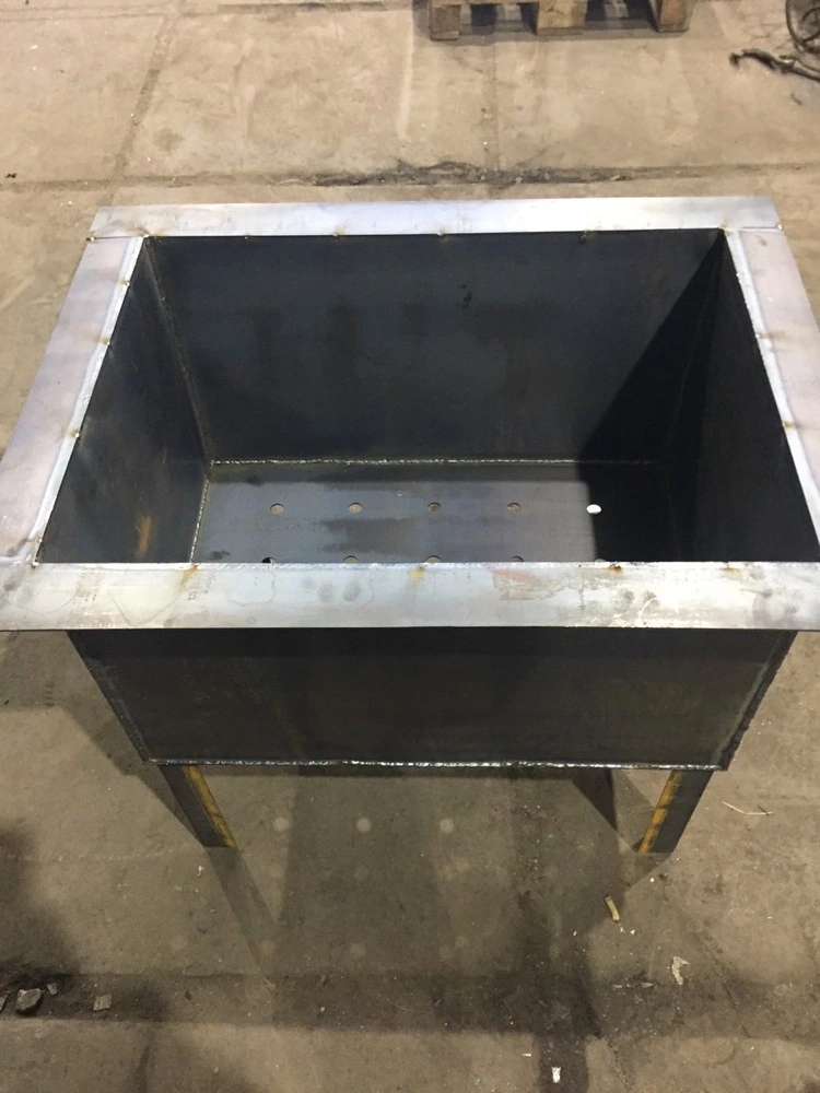 На фото мангал розміром (ВхДхШ, мм) 700х700х500, виготовлений із сталі 3 мм. В дні корпуса мангала передбачені отвори для кращого нагріва та тяги. Короб витяжки та димохід виконані із сталі 1,5 мм. Розмір короба 500х900х600, розмір витяжної труби 350х1700х250. На коробі 4 провушині для цепів підвіса.