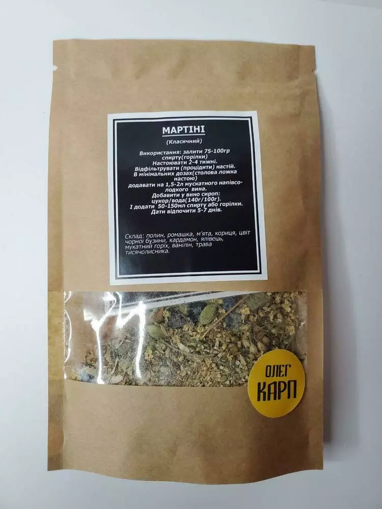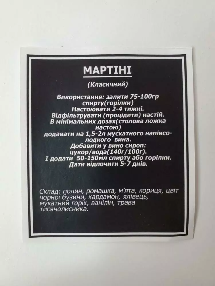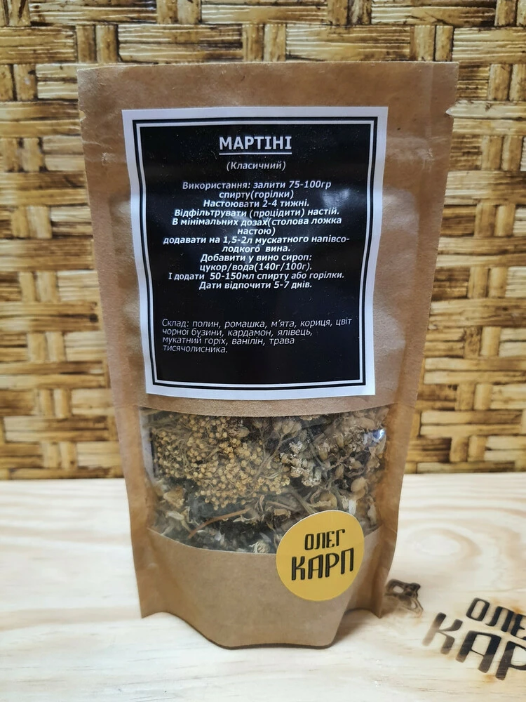 Склад: полин, ромашка, мята, кориця, цвіт чорної бузини, кардамон, ялівець, мускатний горіх, ванілін, трава тисячолистника.