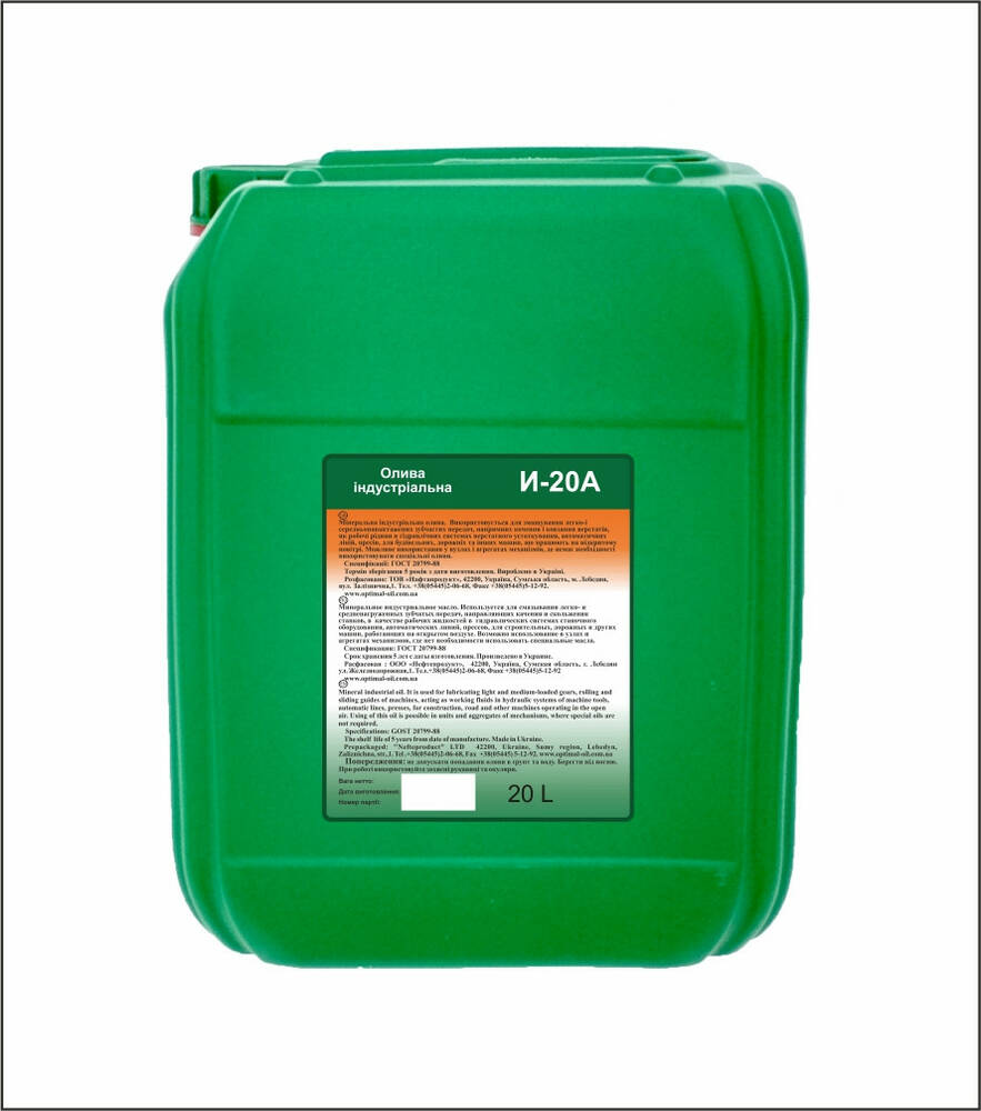 Індустріальна олива І-20А - дистилятна олива або суміш залишкової та дистилятної нафтових олив, отриманих із сірчистих та малосірчистих нафт селективного очищення.