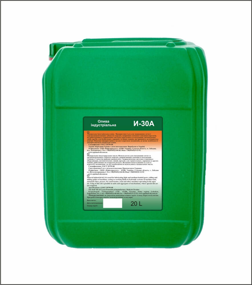 Індустріальна олива І-30А - дистилятна олива або суміш залишкової та дистилятної нафтових олив, отриманих із сірчистих та малосірчистих нафт селективного очищення.